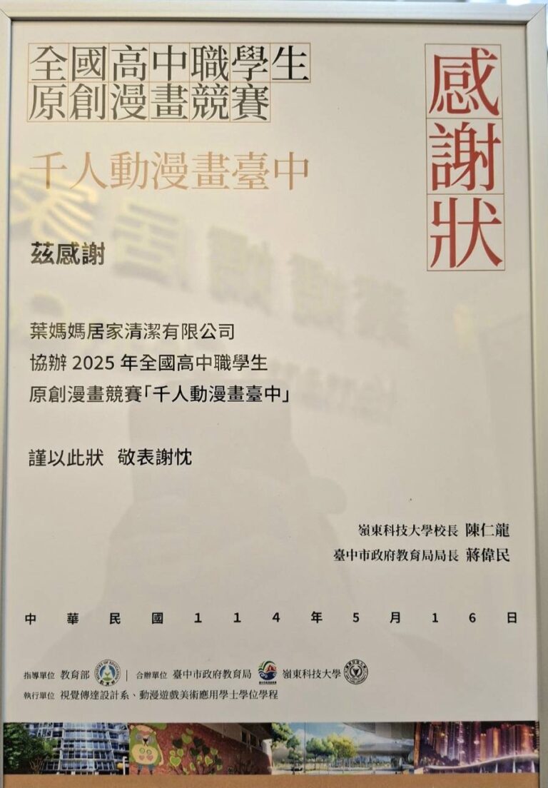 葉媽媽榮耀時刻 榮獲國家品質保證金像獎 榮獲2024年「台灣品質保證金像獎」!這是對我們品質卓越的充分認可。這個榮譽讓我們感到驕傲,也是對我們公司在提供高品質清潔服務方面長期堅持的最好証明。這樣的獎項不僅代表著我們的努力受到肯定,還是我們持續追求卓越的一個見證。這些成就不僅是對我們努力的回應,也是對我們承諾高品質和負責任經營的肯定。公司同仁深獲鼓舞,決心繼續秉持著這樣的信念,致力於為客戶提供卓越的清潔服務,為同行樹立良好的典範。 2024年華人公益節 公益大使